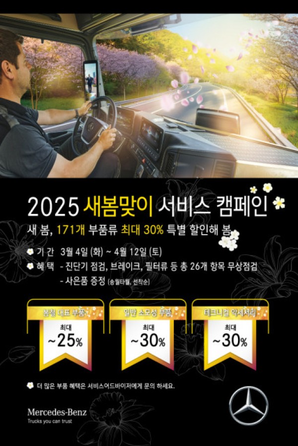 다임러 트럭 코리아(대표이사 안토니오 란다조)가 다가오는 봄을 맞아 메르세데스-벤츠 트럭 고객을 대상으로 주요 부품 최대 30% 할인과 차량 무상 점검 혜택을 제공하는 ‘2025 새봄맞이 캠페인’을 오는 4월 12일까지 실시한다.다임러 트럭 코리아는 겨울철 강추위와 폭…
