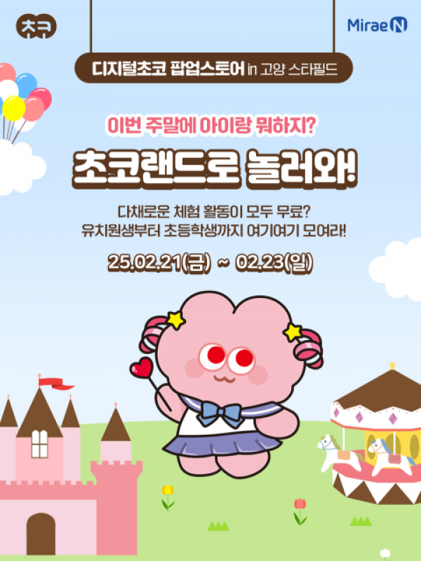 교과서 발행 부수 1위 기업 미래엔이 2월 21일(금)부터 23일(일)까지 스타필드 고양 센트럴 아트리움에서 ‘디지털초코’ 팝업스토어 ‘초코랜드’를 운영한다고 밝혔다.‘미래엔 콘텐츠 페스티벌이 열리는, 아이들의 원더랜드’라는 놀이동산 콘셉트로 진행되는 이번 팝업스토어는…