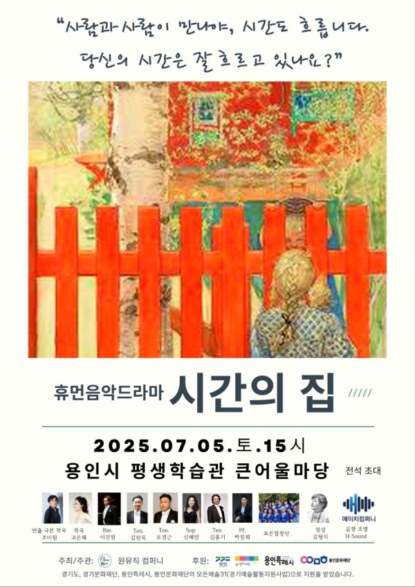 2025년 7월 5일(토) 오후 3시용인시 평생학습관 큰어울마당전석 초대 / 경기문화재단 모든예술31 선정작 “사람과 사람이 만나야 시간도 흐릅니다.당신의 시간은, 지금 잘 흐르고 있나요” 경기문화재단과 용인문화재단의 지원으로…