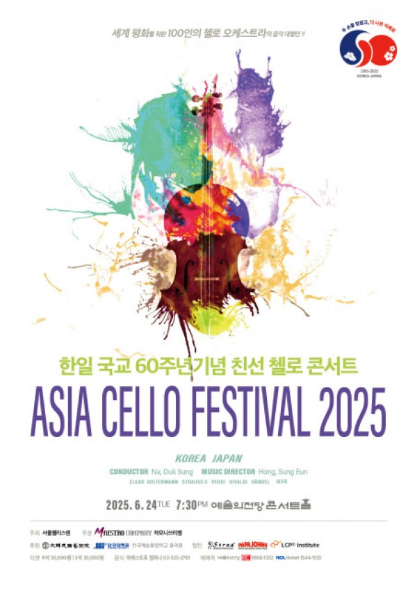 서울첼리스텐이 주최하고 마에스트로 컴퍼니가 주관하는 한일 국교 60주년기념 친선 첼로 콘서트 ‘ASIA CELLO FESTIVAL 2025’가 6월 24일 오후 7시 30분 예술의전당 콘서트홀에서 개최된다.Asia Cello Festival2025년 한일 국교수립 60…