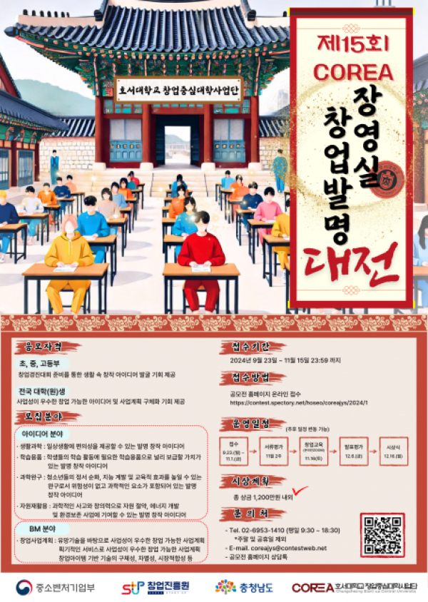 호서대학교 창업중심대학사업단은 우수 발명 아이디어와 아이템을 실현할 수 있는 기회를 제공함으로써 창업문화확산에 기여하기 위해 ‘제15회 COREA 장영실 창업발명대전’을 개최하고, 계획서를 11월 15일까지 접수한다고 밝혔다.공모 주제는 ‘아이디어 분야(생활과학·학습용…