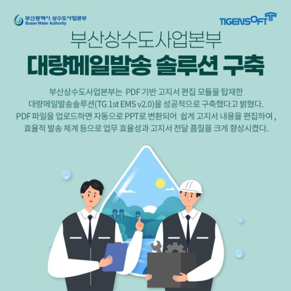 대량메일발송 솔루션 및 통합메시징 솔루션, 설문조사 솔루션 AI 기반 개발/구축 및 SaaS 서비스 전문기업 티젠소프트(대표 고훈호, www.tigensoft.co.kr)는 부산상수도사업본부에 자사 개발 PDF 기반 고지서 편집 모듈을 탑재한 대량메일발송 솔루션(TG …