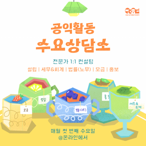 서울시공익활동지원센터(이하 센터)는 비영리조직의 설립과 운영 과정에서 발생하는 어려움을 해소할 수 있도록 맞춤형 컨설팅을 제공하는 ‘공익활동 수요상담소’ 참여자를 이달 24일까지 모집한다.‘공익활동 수요상담소’는 설립, 세무·회계, 법률, 노무, 모금, 홍보…